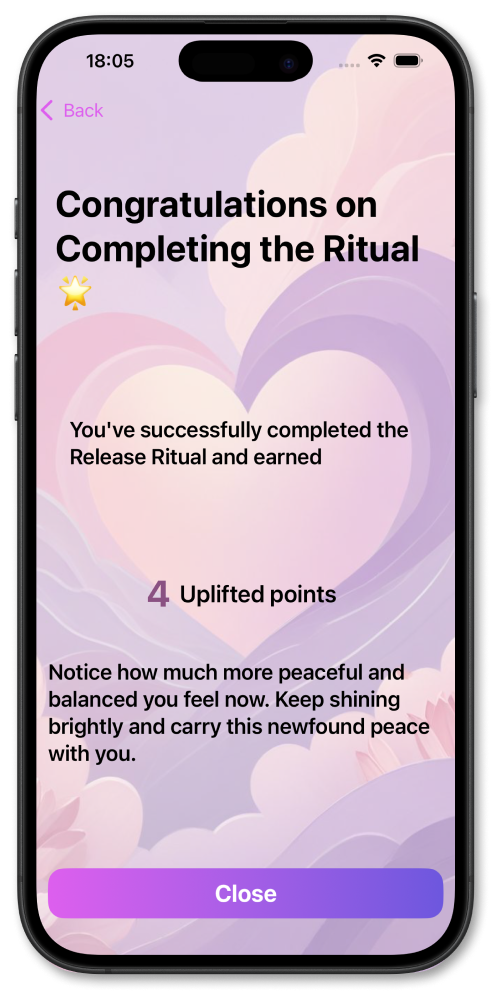 • Uplift points: track how much lighter you felt after sessions (Release).